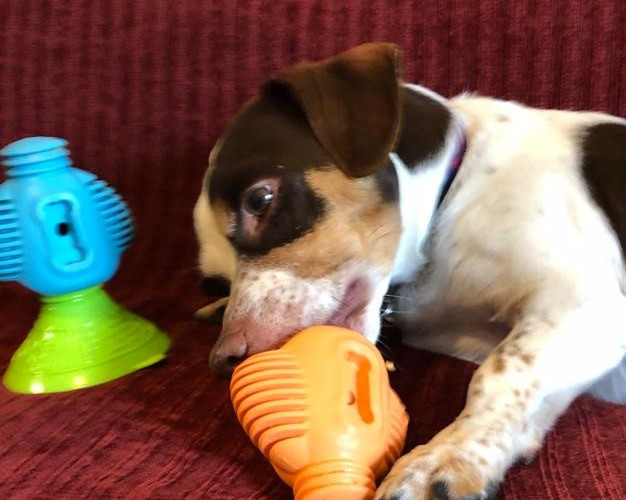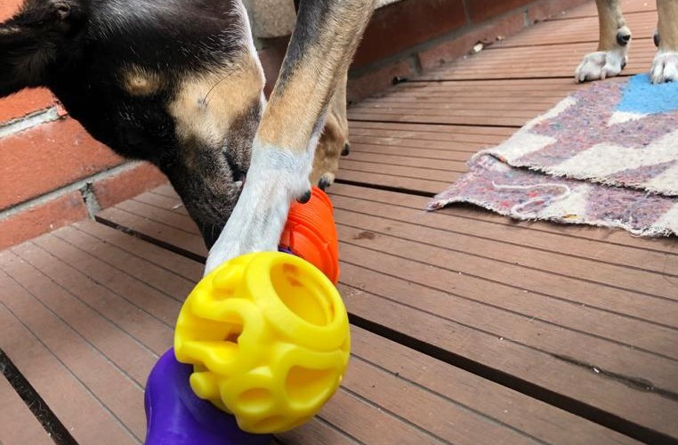 As you can connect the toys in many different ways; and our pups are only starting, we are keeping it simple, combining 2 to 3 toys tops. Every day we try different combinations of toys and treats, being creative to surprise our little doggos with something new.